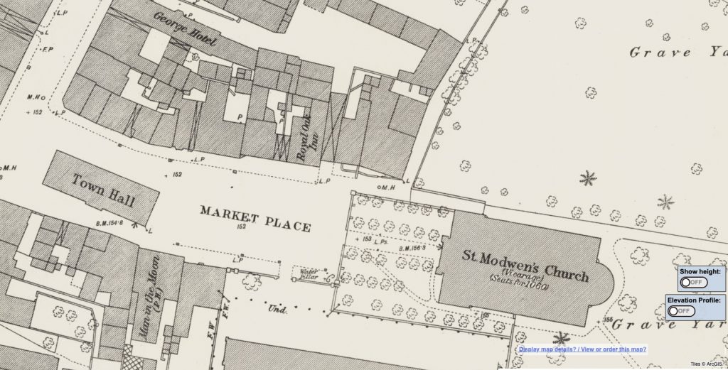 An 1888 map notes the church had seating for 1060 people. It also shows 32 trees planted around the front of the church, which appear in the 1839 painting. Alas, all of those trees are long gone, but many of the buildings around the market square still exist today.